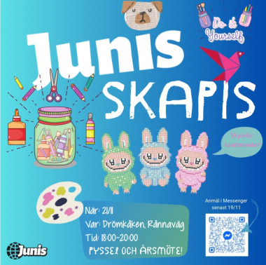 Junis finns i hela landet och erbjuder kul och trygg verksamhet där alla barn mellan 6-15 år är välkomna. Är du från året dy fyller 15 år kan du bli ledare. Vi hoppas du vill bli med! Som medlem i Junis är du med i en förening. Många föreningar träffas varje vecka och gör roliga saker tillsammans. En del spelar teater, gör lekar, bakar, testar på olika sporter, pysslar, har disco eller ser på film. I andra föreningar träffas man mer sällan och gör utflykter, åker på läger och annat kul.