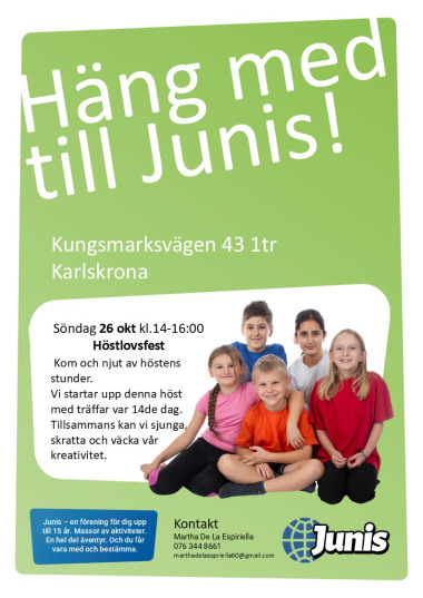 Söndag 26 oktober kl 14-16 Höstlovsfest uppstart Junis Kungsmarksvägen 43 Karlskrona Obs ändrat datum och justerad tid. Ingen föranmälan.