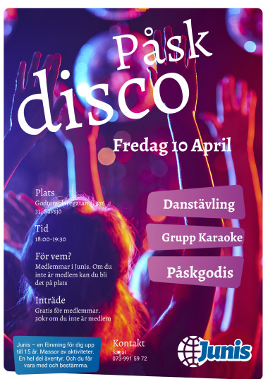 I Tenhult älskar vi disco – gör du också det? Häng med i Junis Partyrävar, helt kostnadsfritt! Inför kommande disco söker vi viktiga vuxna som kan stötta upp när vi har disco. Vill du hjälpa till genom att stå i kiosken, städa eller öka tryggheten utomhus? Hör av dig till Sofia Klasson, sofia.klasson@junis.se